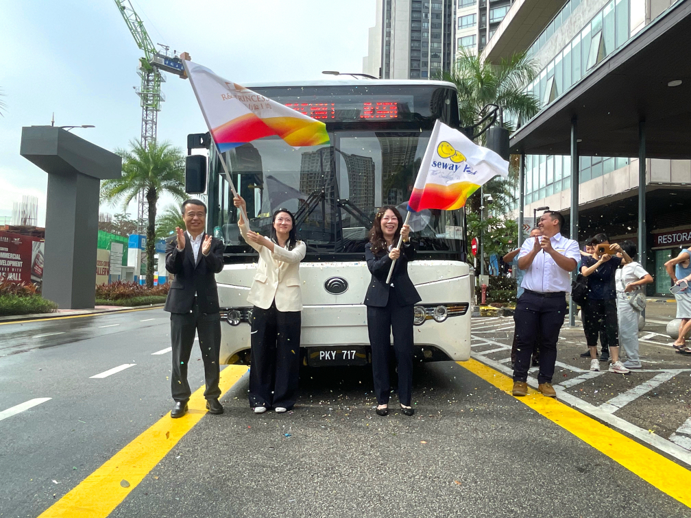 Ms. Zhu WenTing, Deputy General Manager,Assistant to Chairman,General Manager of Overseas Division of R&F Group, Mr. Li Mingliang, Chairman of R&F Malaysia, and Ms. Lim Zhenfang, Deputy Managing Director of Handal Indah Sdn. Bhd., wave the flag in front of the R&F shuttle bus, officially launching the free shuttle service between R&F Princess Cove and the JB CIQ.